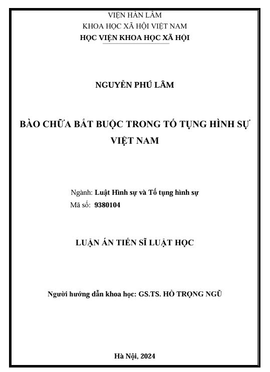 Trân trọng giới thiệu Luận án Tiến sĩ: "BÀO CHỮA BẮT BUỘC TRONG TỐ TỤNG HÌNH SỰ VIỆT NAM" của tác giả Nguyễn Phú Lâm