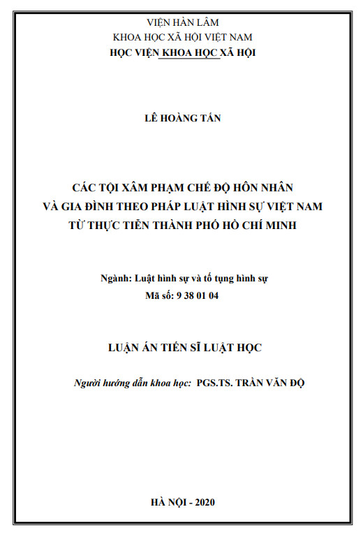 Trân trọng giới thiệu Luận án Tiến sĩ: CÁC TỘI XÂM PHẠM CHẾ ĐỘ HÔN NHÂN VÀ GIA ĐÌNH THEO PHÁP LUẬT HÌNH SỰ VIỆT NAM TỪ THỰC TIỄN THÀNH PHỐ HỒ CHÍ MINH của tác giả Lê Hoàng Tấn