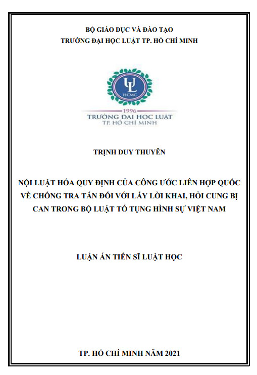 Trân trọng giới thiệu Luận án Tiến sĩ: NỘI LUẬT HÓA QUY ĐỊNH CỦA CÔNG ƯỚC LIÊN HỢP QUỐC VỀ CHỐNG TRA TẤN ĐỐI VỚI LẤY LỜI KHAI, HỎI CUNG BỊ CAN TRONG BỘ LUẬT TỐ TỤNG HÌNH SỰ VIỆT NAM Của tác giả Trịnh Duy Thuyên