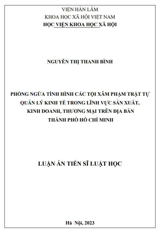 LUẬN ÁN TIẾN SĨ: PHÒNG NGỪA TÌNH HÌNH CÁC TỘI XÂM PHẠM TRẬT TỰ QUẢN LÝ KINH TẾ TRONG LĨNH VỰC SẢN XUẤT, KINH DOANH, THƯƠNG MẠI TRÊN ĐỊA BÀN THÀNH PHỐ HỒ CHÍ MINH
