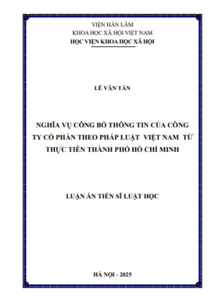 Trân trọng giới thiệu Luận án Tiến sĩ: "NGHĨA VỤ CÔNG BỐ THÔNG TIN CỦA CÔNG TY CỔ PHẦN THEO PHÁP LUẬT VIỆT NAM TỪ THỰC TIỄN THÀNH PHỐ HỒ CHÍ MINH" của tác giả Lê Văn Tấn
